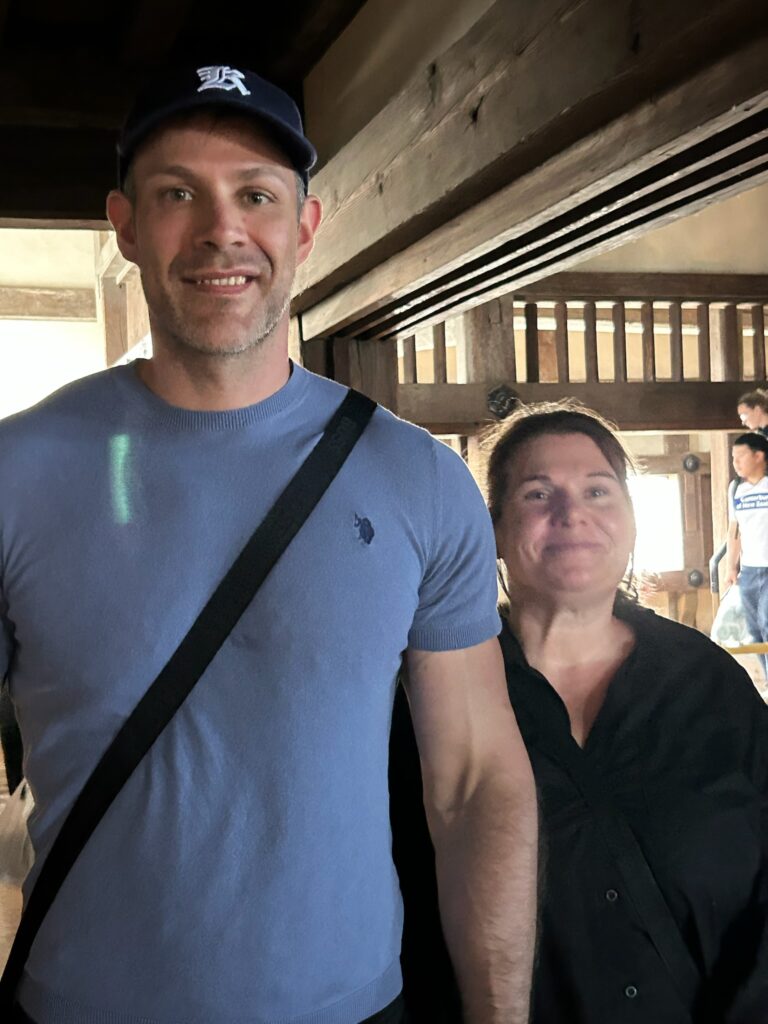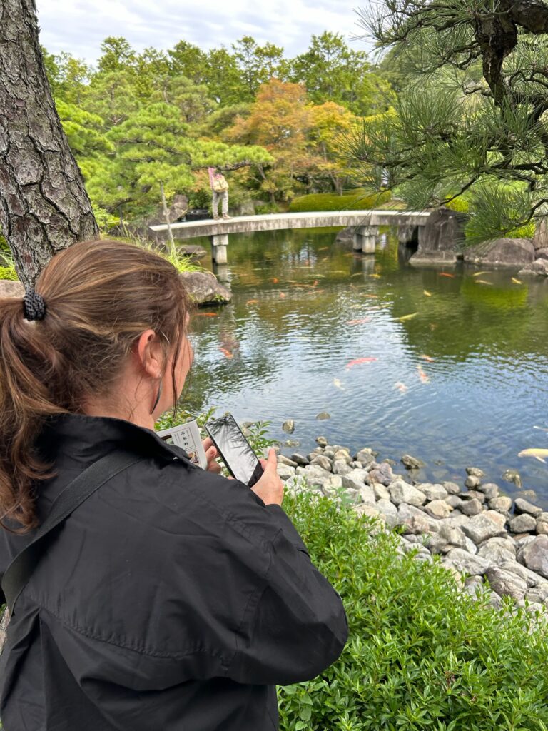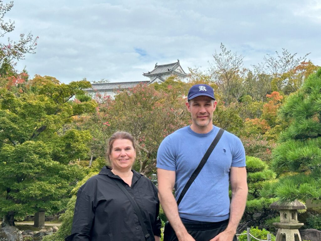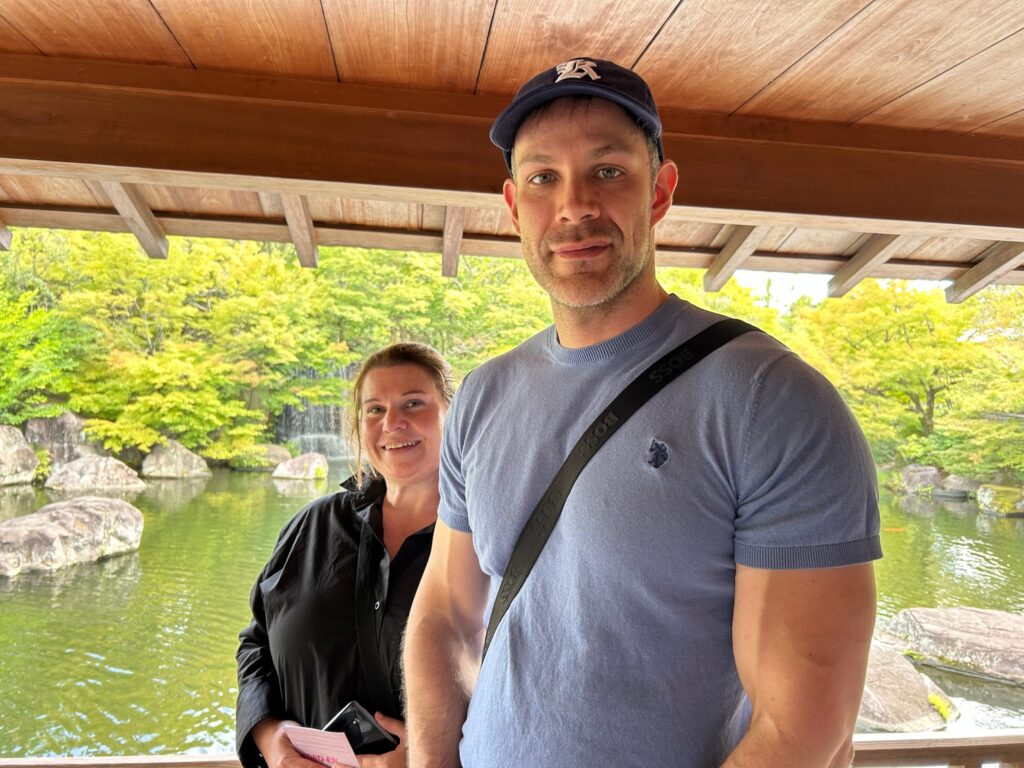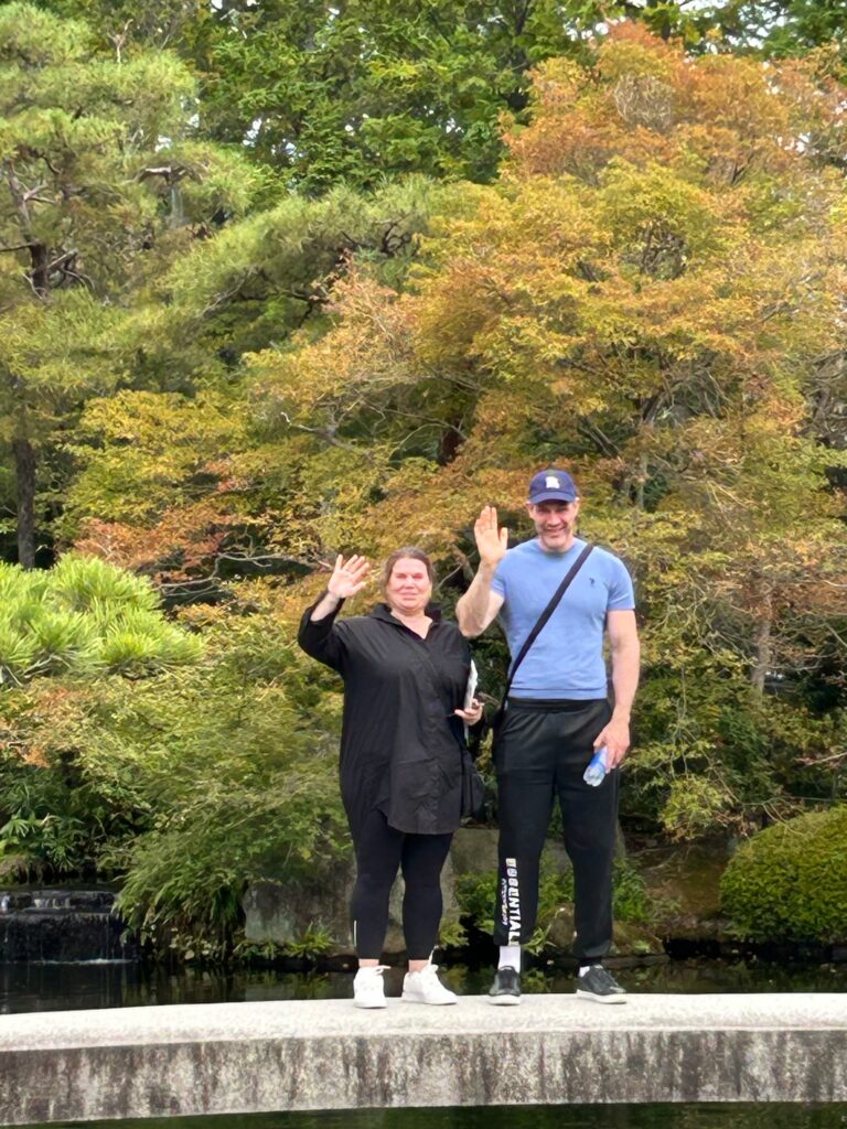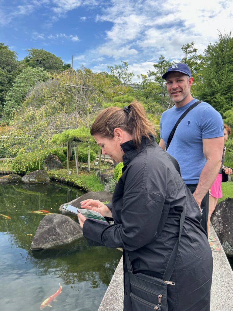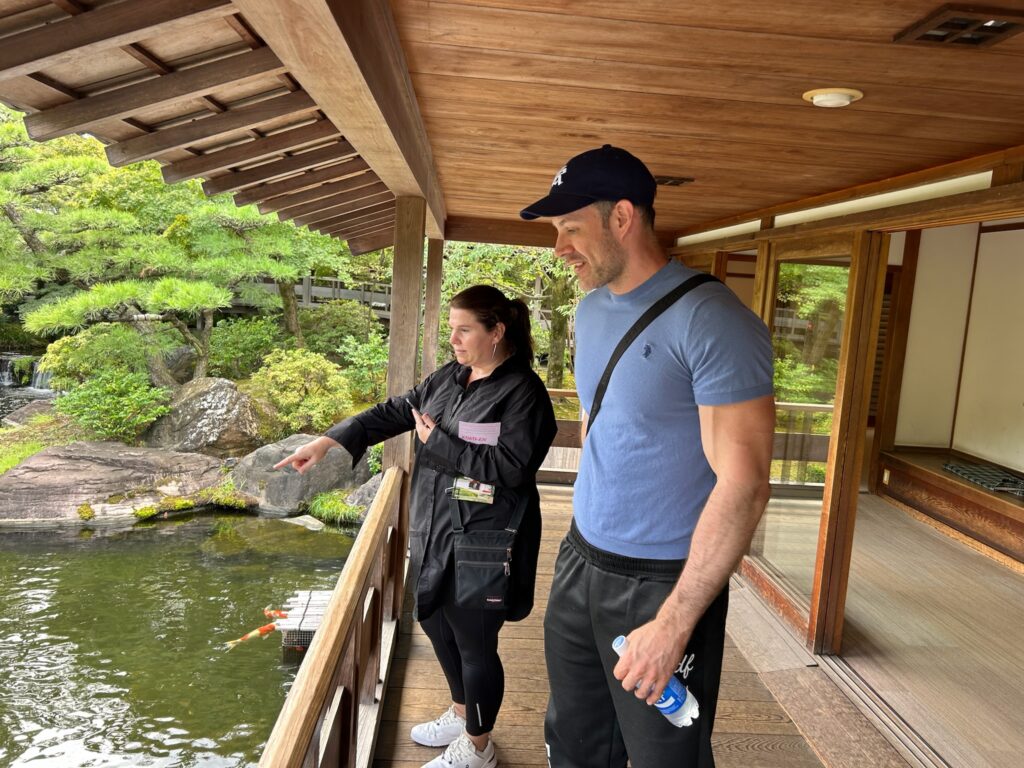At Koko-en Garden 🌿🎋, Svenja, who LOVES koi 🐟❤️, was absolutely thrilled 😍! She and Alex even named the biggest koi “Alex” 🐠👑 because it was as big as Alex himself 😄👏. They really enjoyed the lush greenery 🌳🌸 and were amazed to spot the turrets of Himeji Castle from the garden 🏯✨.